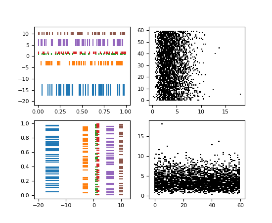 Mehrere Ereignisgruppen können als Liste von array-ähnlichen Objekten übergeben werden. Jede Gruppe kann unabhängig gestylt werden, indem Listen von Werten an lineoffsets, linelengths, linewidths, colors und linestyles übergeben werden.