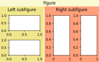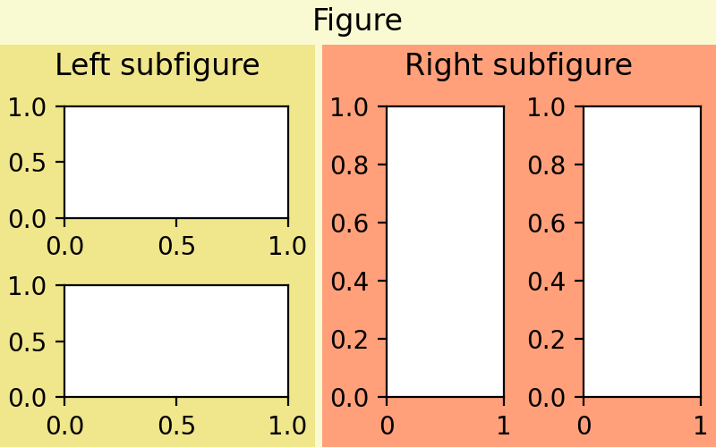 Matplotlib hat das Konzept einer SubFigure, die eine logische Figur innerhalb einer Elternfigur Figure ist. Sie verfügt über viele der gleichen Methoden wie die Elternfigur. Siehe Verschachtelte Achsenlayouts.