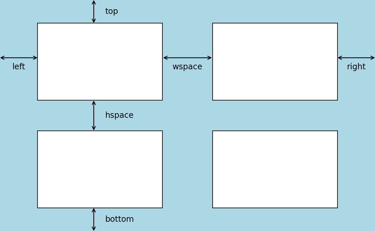 - subplots_adjust(left=None, bottom=None, right=None, top=None, wspace=None, hspace=None)[source]#