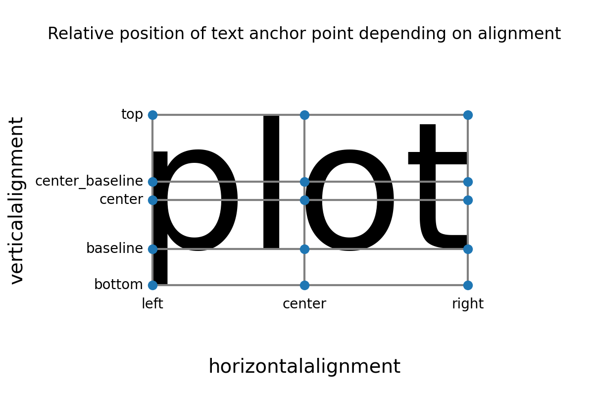 Texte werden relativ zu ihrem Ankerpunkt ausgerichtet, abhängig von den Eigenschaften horizontalalignment (Standard: left) und verticalalignment (Standard: baseline).