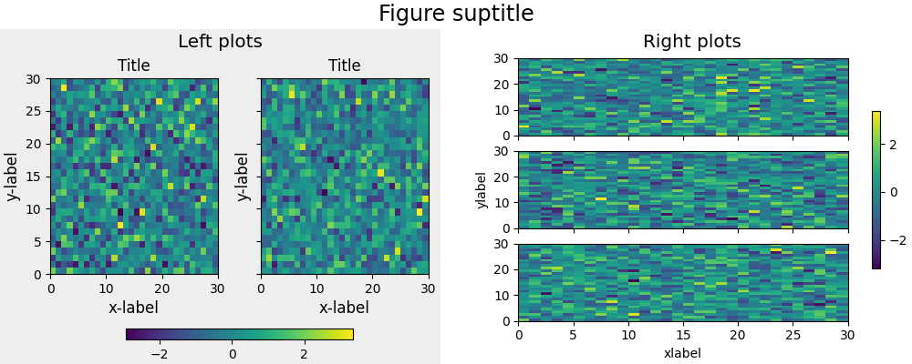 Neue Funktionalitäten figure.Figure.add_subfigure und figure.Figure.subfigures ermöglichen die Erstellung virtueller Figuren innerhalb von Figuren. Ähnliche Verschachtelung wurde bisher mit verschachtelten gridspecs durchgeführt (siehe Verschachtelte Gridspecs). Dies erlaubte jedoch keine lokalisierten Figure-Künstler (z.B. eine Colorbar oder einen Suptitle), die nur zu jedem Subgridspec gehörten.