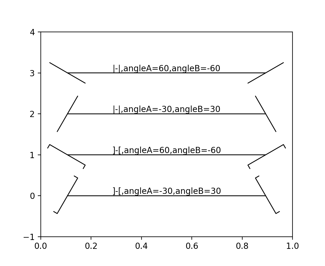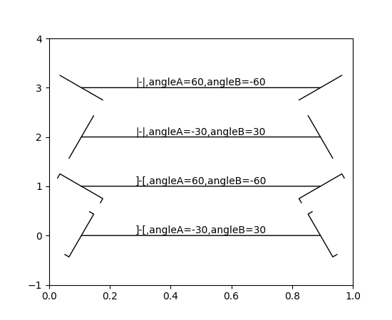 Bei den Bracket-Pfeilstilen (]-[, ]-, -[ oder |-|, die an den arrowstyle Parameter von FancyArrowPatch übergeben werden) angegebene Winkel werden jetzt angewendet. Zuvor waren die Optionen angleA und angleB erlaubt, hatten aber keine Wirkung.