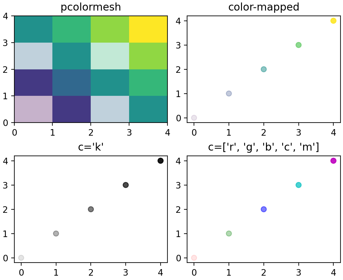 Zuvor konnte der Alpha-Wert, der die Transparenz in Collections steuert, nur als Skalar angegeben werden, der auf alle Elemente in der Collection angewendet wurde. Zum Beispiel hätten alle Marker in einem scatter-Plot oder alle Vierecke in einem pcolormesh-Plot denselben Alpha-Wert.