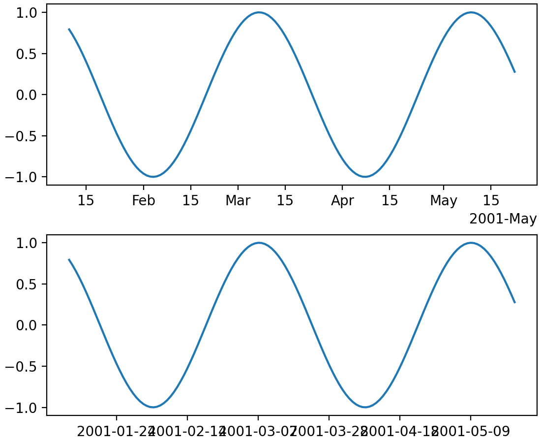 Das neue rcParams["date.converter"] (Standard: 'auto') ermöglicht das Umschalten zwischen matplotlib.dates.DateConverter und matplotlib.dates.ConciseDateConverter unter Verwendung der Zeichenfolgen 'auto' bzw. 'concise'.