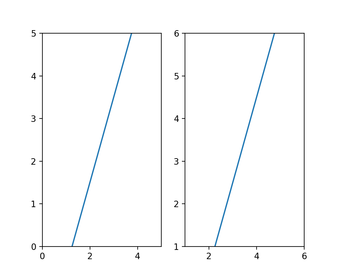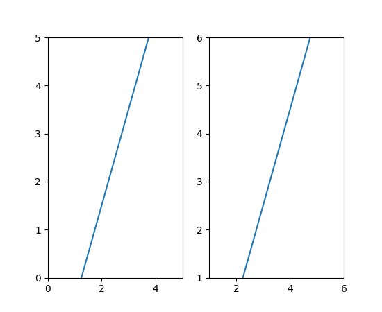 Dies kann beispielsweise mit ax.transAxes zum Zeichnen von Linien mit einer festen Steigung verwendet werden. Im folgenden Diagramm erscheint die Linie durch denselben Punkt in beiden Achsen, obwohl sie unterschiedliche Datenlimits anzeigen.