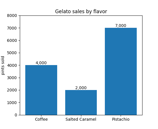 ax.set(ylabel='pints sold', title='Gelato sales by flavor', ylim=(0, 8000))